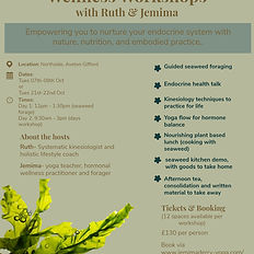 2 day endocrine workshop. Begins on the 7th Oct where you will be guided through a seaweed forage, followed by a holistic workshop on the 8th. more details to be seen on the poster found under 'whats on' on my website.